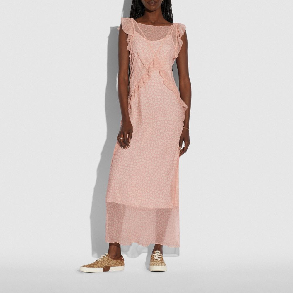 Llama la atención yendo a todas partes con nuestro vestido de seda ligera con espalda de pico pronunciado. Este estilo romántico cortado al bies está detallado con mangas de capelina y coquetos volantes cruzados.