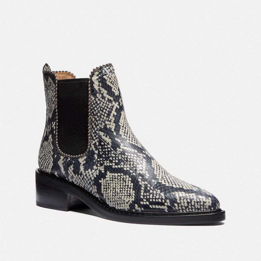 La bota Bowery es un complemento básico de la temporada hecho de piel de serpiente natural. Presenta un acabado de un brillante reborde de abalorios y ribetes en los tobillos acanalados para ponerse y quitarse con facilidad.