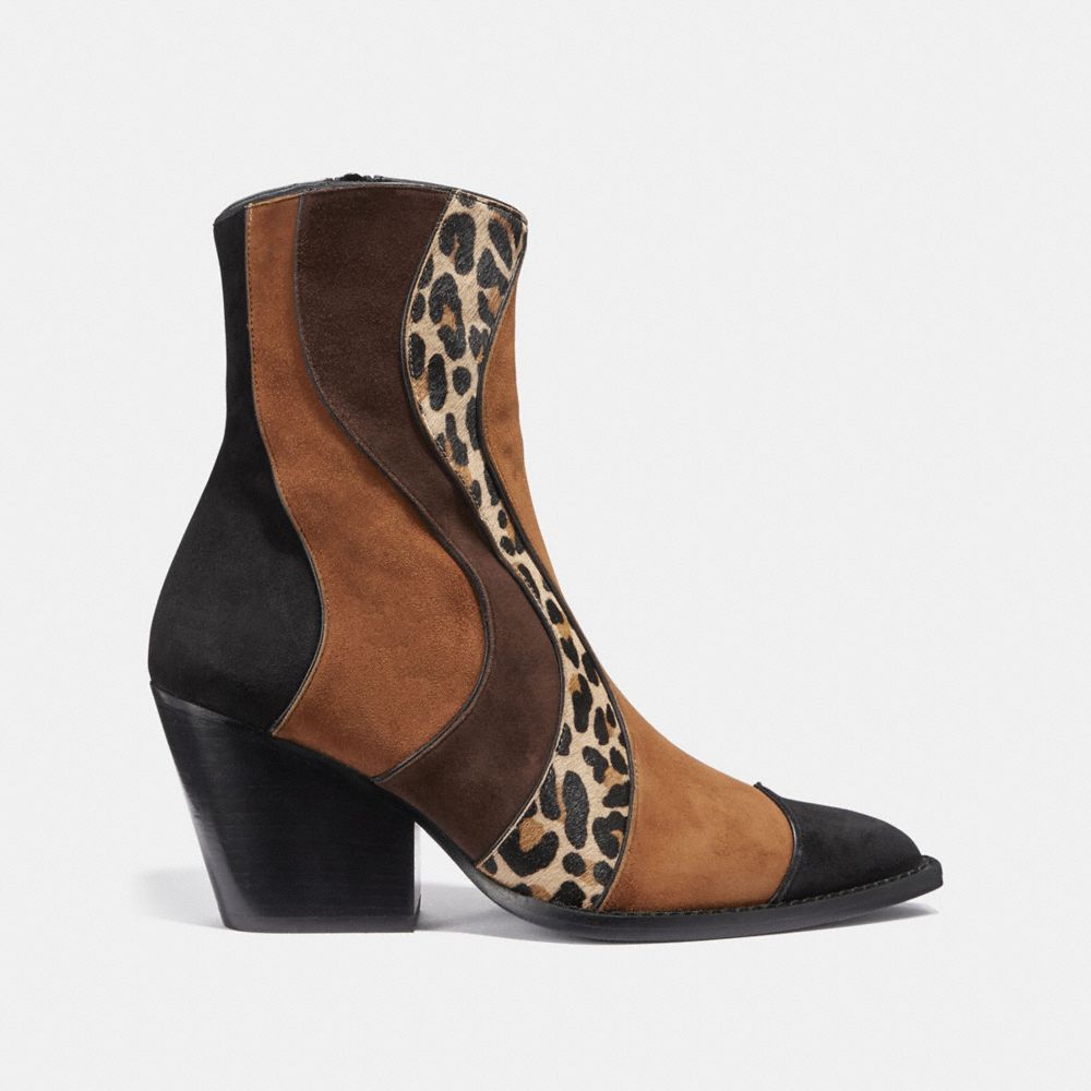 Moderno, aunque con el carácter de los años setenta, este botín con cremallera está elaborado en un patchwork gráfico de suave ante y piel de becerro estampada. Con punteras en punta inspiradas en el Oeste y un grueso tacón en bloque, este versátil estilo queda estupendo con vestidos amplios o vaqueros.