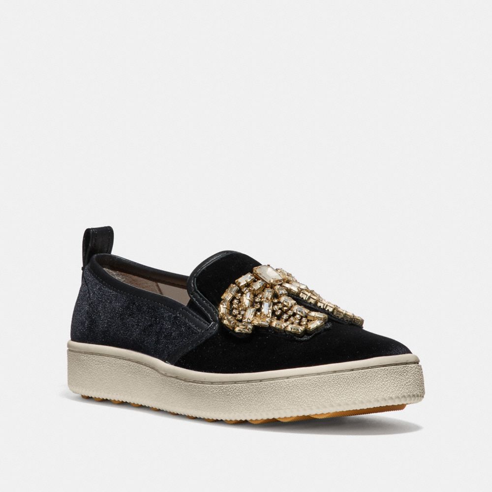 Un guiño a la cultura del skate de California; estas zapatillas fáciles de poner en suave terciopelo cuentan con un detalle de lazos de cristal de inspiración art decó para añadir brillo y encanto femenino. Con su gruesa suela de goma son perfectas para patear la ciudad.