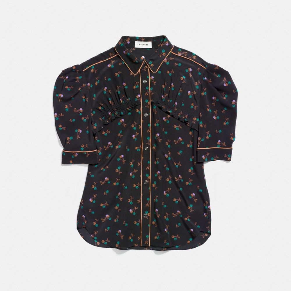 Con mangas abullonadas, cuello pico y un estampado de cereza inspirado en la década de los 50 en sorprendentes colores, esta blusa de seda ligeramente transparente es una reinterpretación en femenino de la ropa del Oeste. Incluye ribetes al estilo de las sillas de montar que son un guiño a la herencia artesana de la piel de Coach.