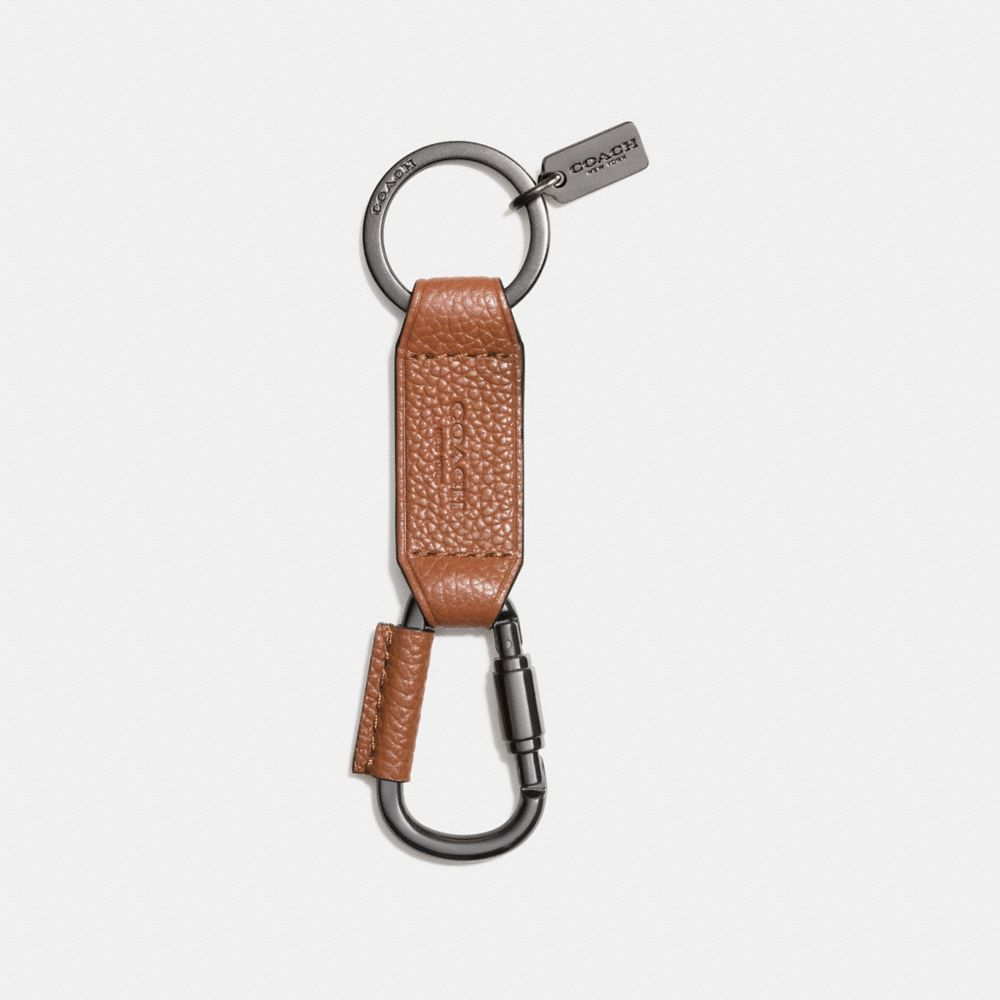 This handsome piece does double duty, with a functional carabiner and a classic split key ring. Crafted in polished nickel hardware and pebble leather embossed with the Coach logo, the everyday design securely attaches to a chain, a belt loop or the inside of a briefcase or bag.