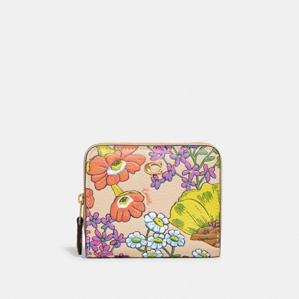 Esta cartera con billetera compacta, confeccionada con piel granulada y pulida con estampado floral, incluye un cómodo bolsillo con cremallera exterior para monedas, recibos, auriculares de botón y otros pequeños objetos imprescindibles. Se abre para revelar seis ranuras para tarjeta y un compartimento para billetes completo.