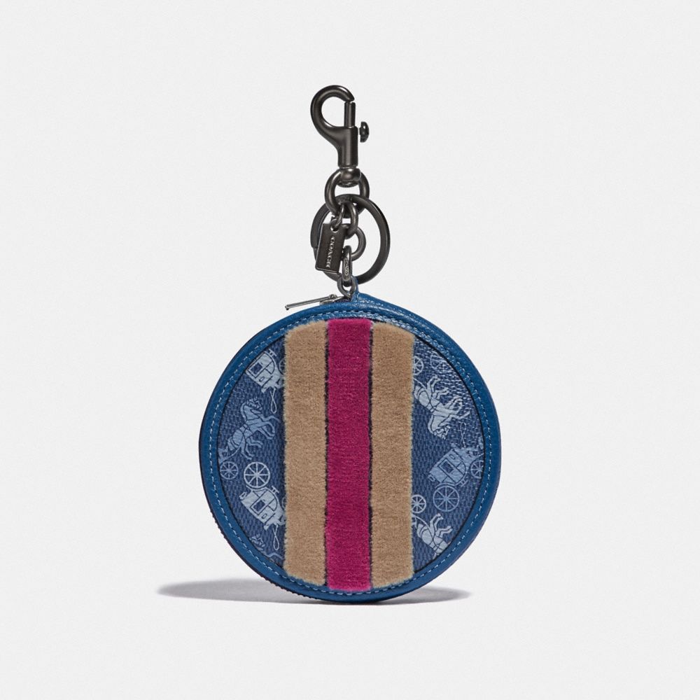 Acabado con un mosquetón para adjuntarlo a tu bolso favorito, este monedero redondo es perfecto para tener a mano tus auriculares inalámbricos, tarjetas, billetes, bálsamo labial y monedas. Acabado con unas deportivas franjas universitarias de suave terciopelo acolchado, el estilo de compartimento individual está confeccionado con piel granulada pulida y resistente lona revestida y cuenta con nuestro icónico motivo del caballo y el carruaje.