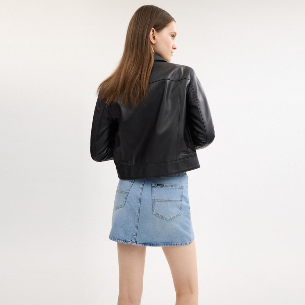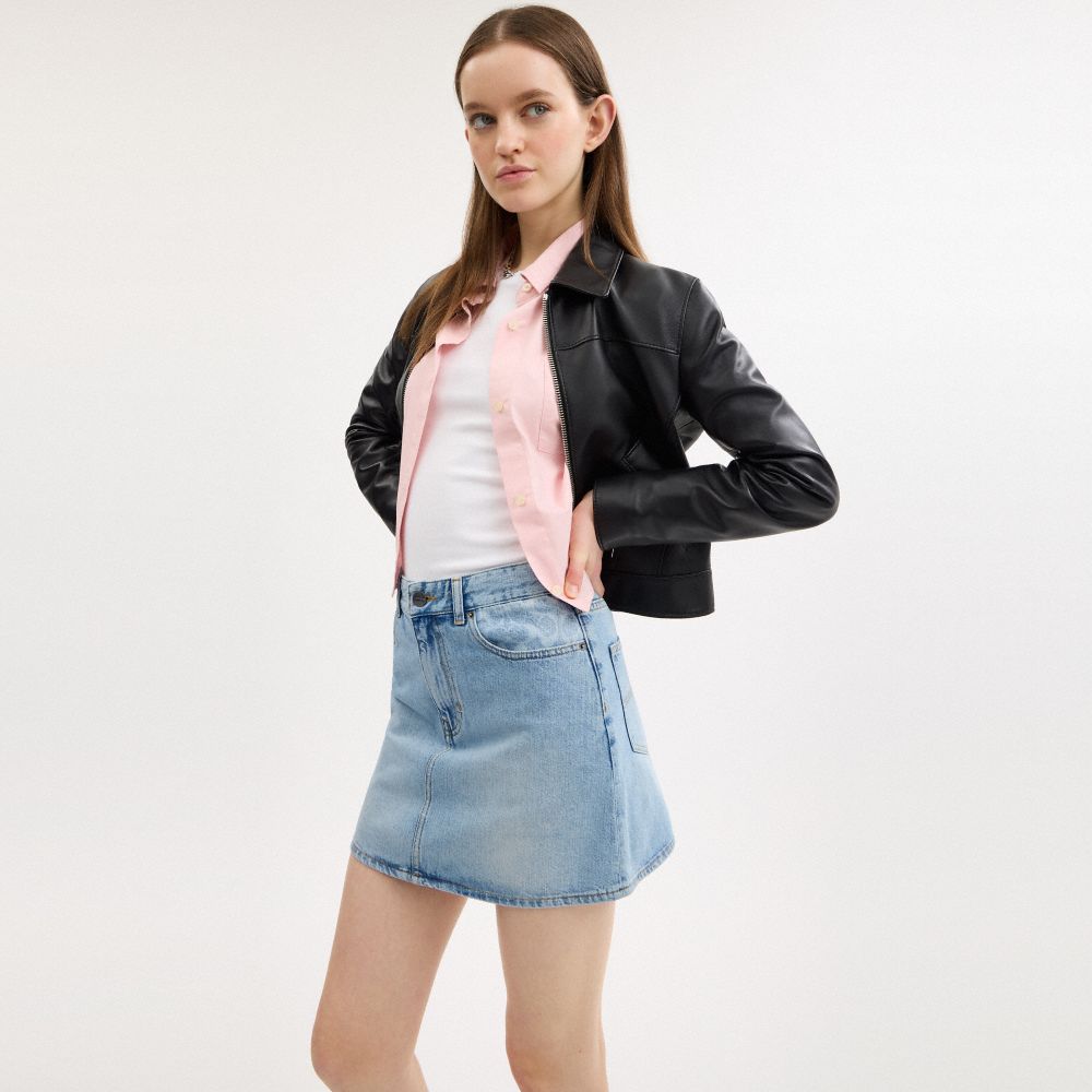 The Denim Mini Skirt is your go-to for effortless style. Crafted of cotton, this women’s mini skirt features slip pockets, leather details and a classic denim wash. Pair it with your favorite tee and sneakers for a laid-back vibe or dress it up with a blouse and boots for a night out—this skirt adapts to your style seamlessly.