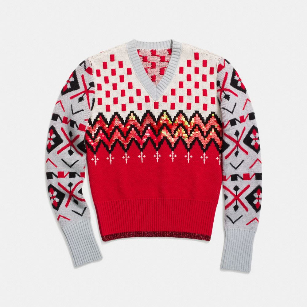 Elaborado en una cómoda mezcla de lana y cachemira, con una atrevida mezcla de diseños, este jersey de cuello en V es un giro moderno de los tradicionales jerseys de jacquard. Densas capas de lentejuelas y un dobladillo de lúrex le añaden una textura de lujo.