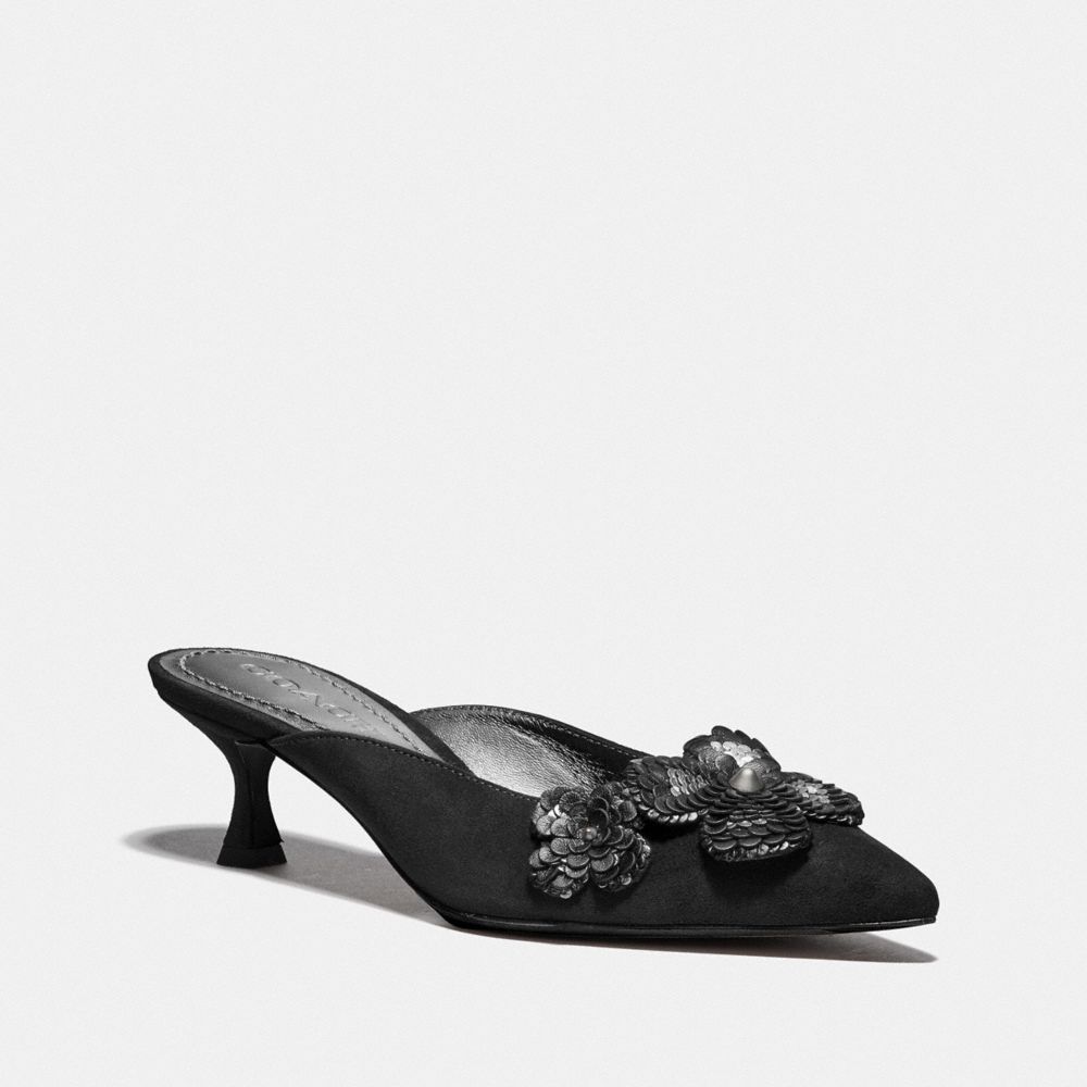 Su tacón bajo y su parte superior curva hacen de esta mule puntiaguda una opción versátil para el día o la noche. Confeccionada en suave ante, está acabada con lentejuelas de piel metalizadas puestas a mano.