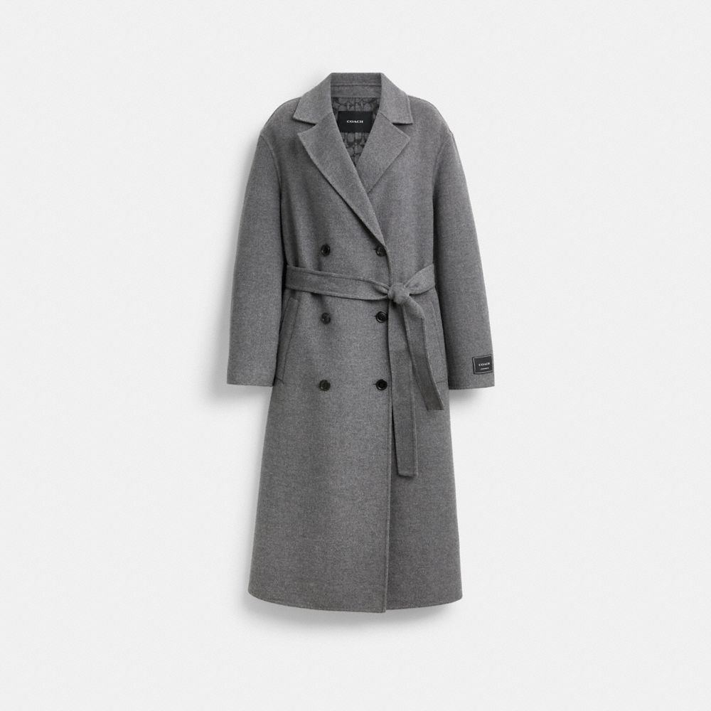 Este abrigo inspirado en las gabardinas, un look elegante para el frío, está confeccionado en una mezcla de lana de doble cara con un hermoso drapeado y una superficie lisa y uniforme en ambos lados. Con solapa de pico, cintura con cinturón y bolsillos abiertos, la silueta de doble botonadura se completa con una abertura trasera para mayor movilidad y nuestra etiqueta Coach en la manga.