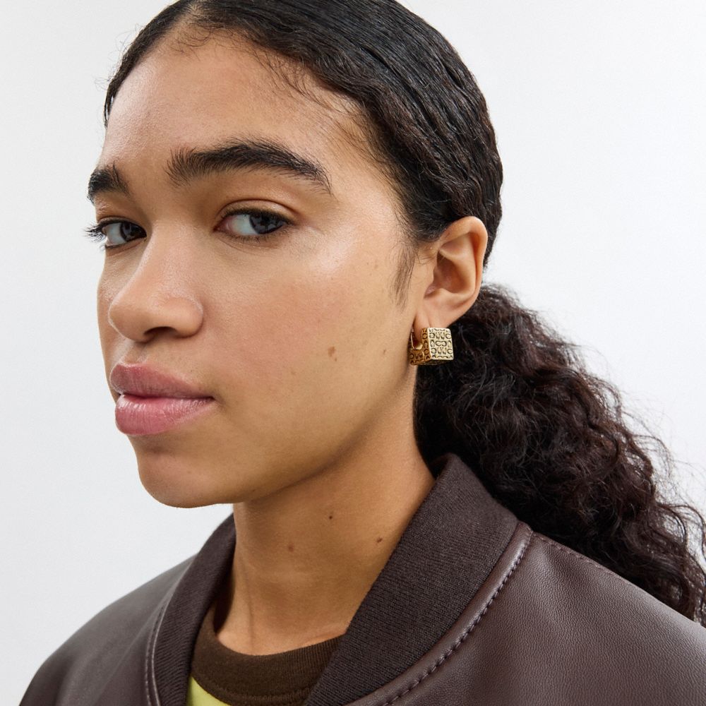 Estos pendientes en forma de cubo, de silueta moderna, llevan nuestra firma para un estilo Coach icónico. Este par elegante y minimalista se completa con un sencillo cierre de clic.