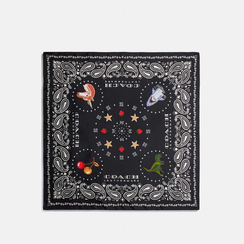 Este pañuelo de seda incluye las mascotas de Coach: Rexy, Uni y Sharky y también estrellas, fresas y nuestros nostálgios motivos retro de cerezas. La ligera bandana está terminada con un patrón tradicional de estampado Americana.