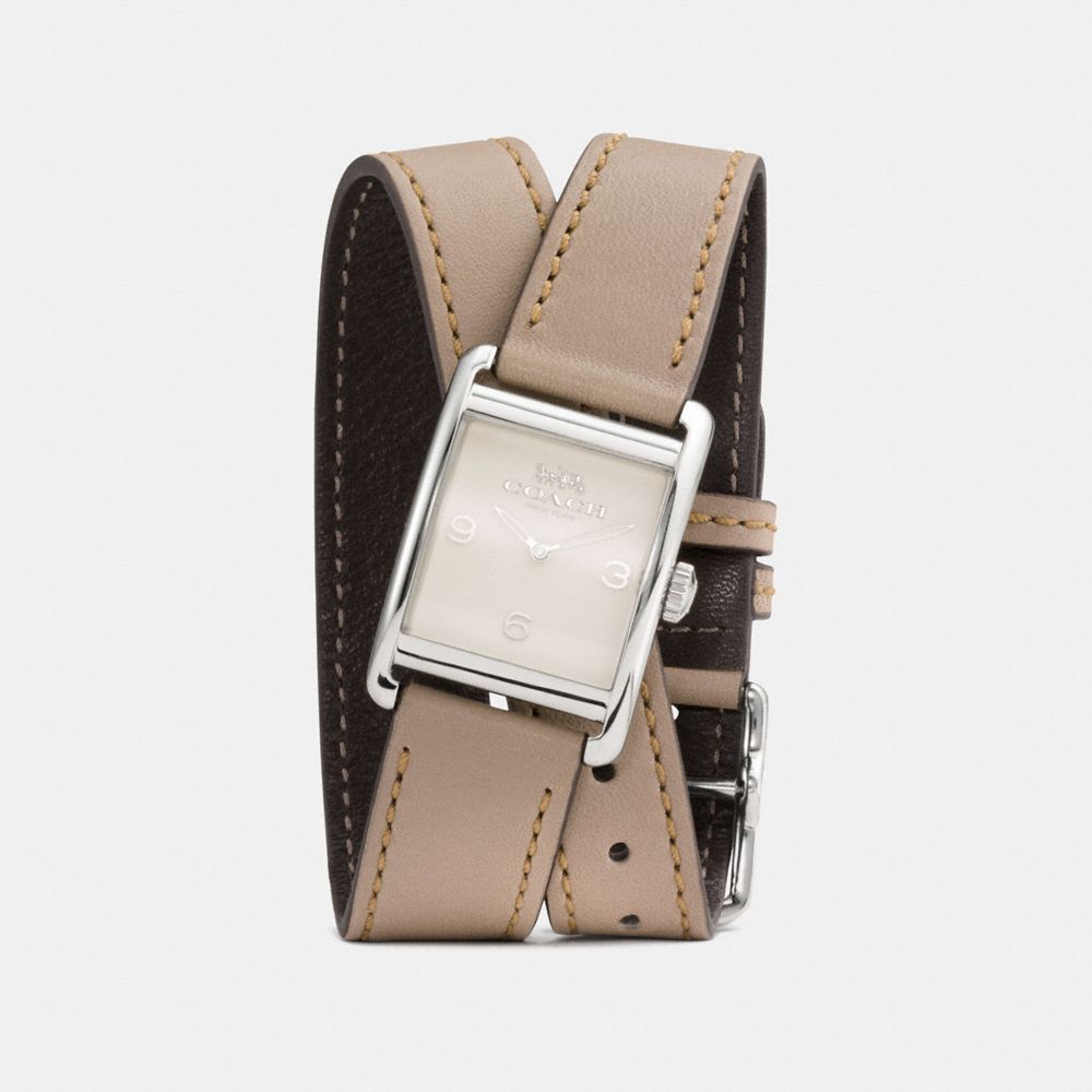 La distintiva forma del reloj Renwick está inspirada en los icónicos herrajes de los bolsos Coach. Su correa de dos colores envolvente añade un toque inesperado.