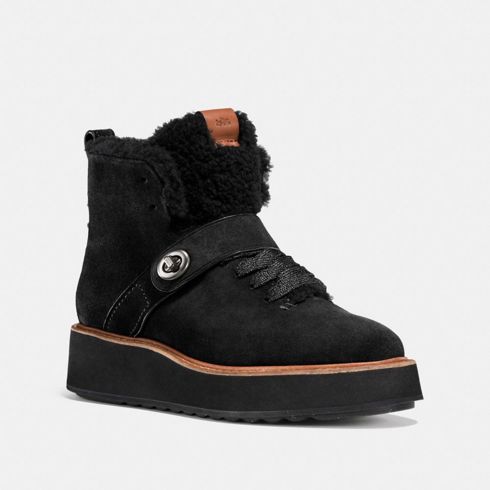 La artesanía exclusiva de Coach y los detalles se combinan en esta ecléctica bota. Está elaborada en ante y borreguillo, e incluye una gruesa correa con un icónico cierre de giro. Su versátil silueta está acabada con una dramática suela de plataforma, lazadas brillantes y un colgante extraíble en el tirados de la cremallera trasera.